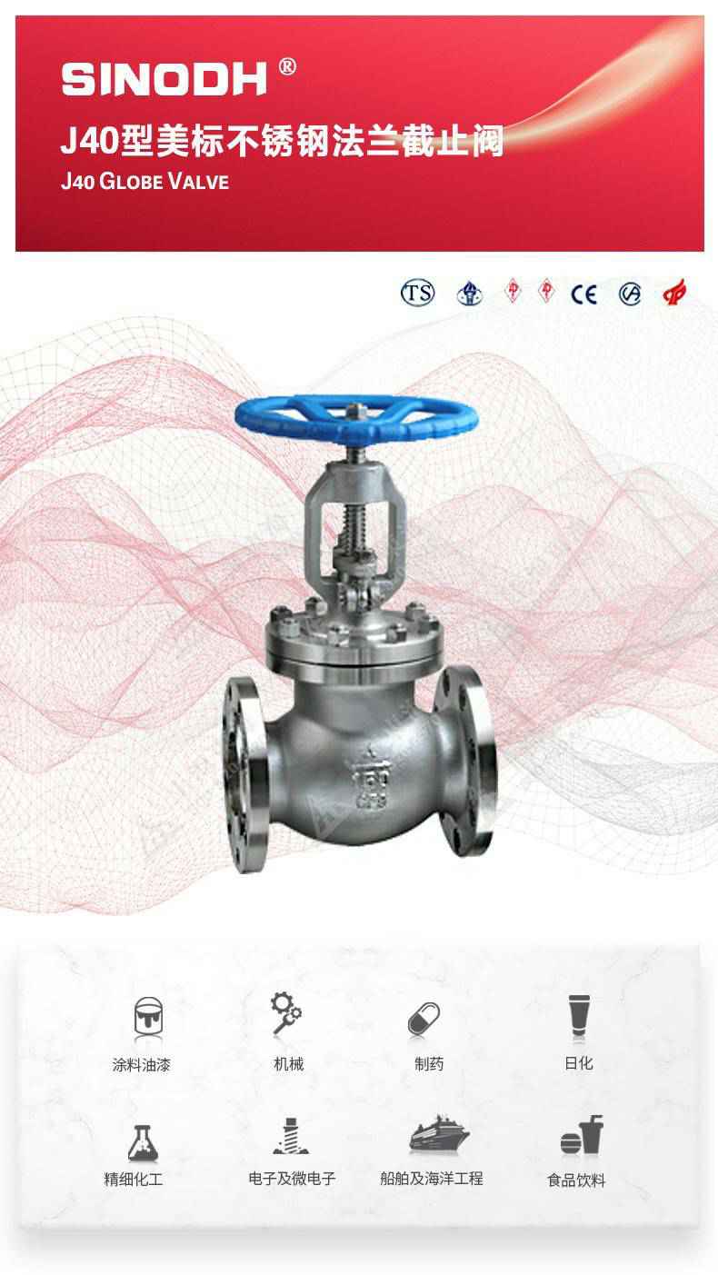 J40型美标不锈钢截止阀,为太原永强电子产品研发有限公司自主研发生产。本产品的设计制造符合美国国家标准ANSIB16.34,美国石油学会标准AP1 6D和AP I 600要求,产品结构紧凑密、刚性好、封性性能优秀是一种最常见的启闭阀,利用闸板的上下工作来接通(全开)和截断(全关)管道中的流体介质。